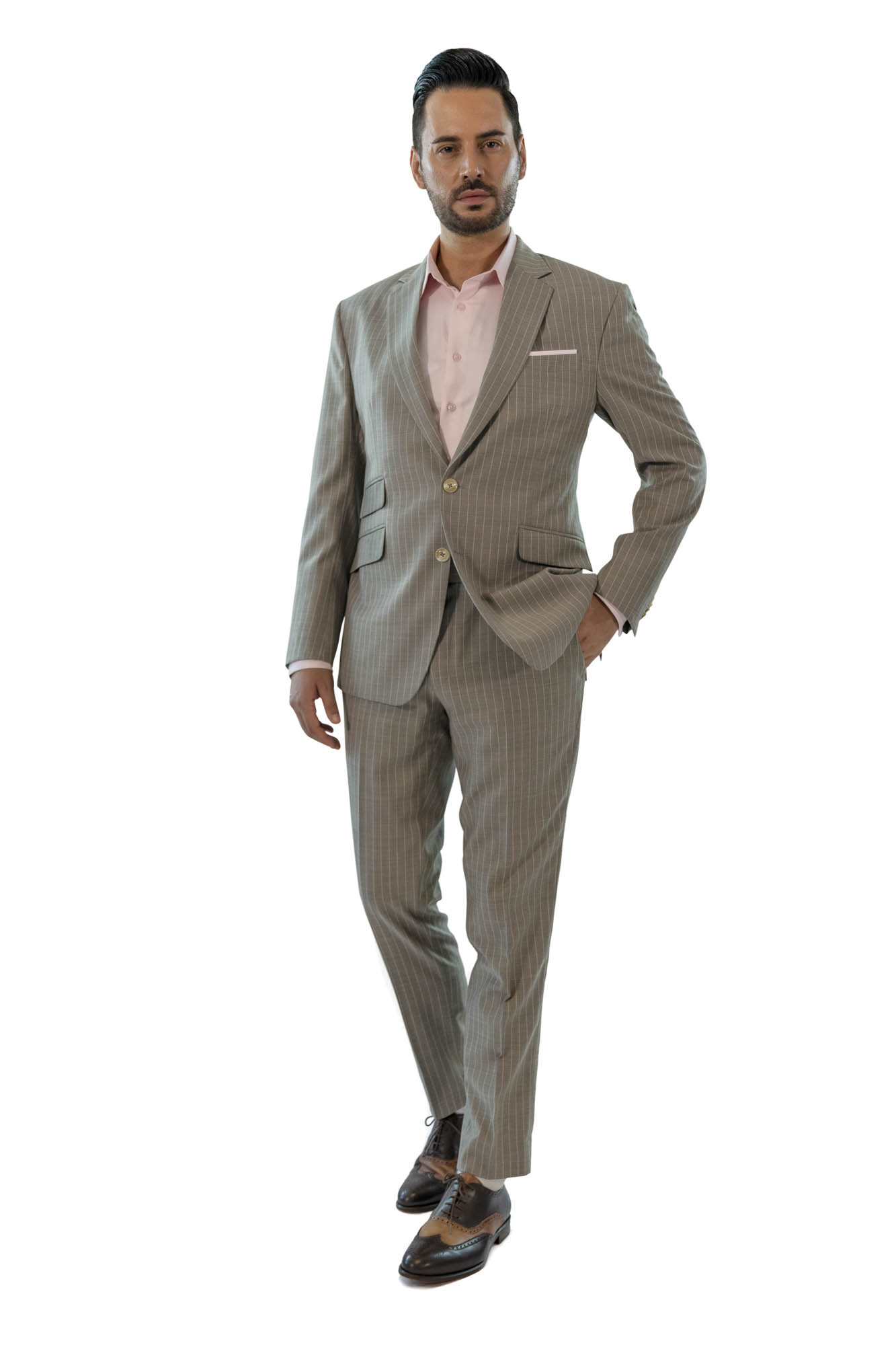 These dynamic grey trousers boast an ultra-fine pink thread with white stripes. It is made from crease-resistant wool and features a classic belt and cross pockets.