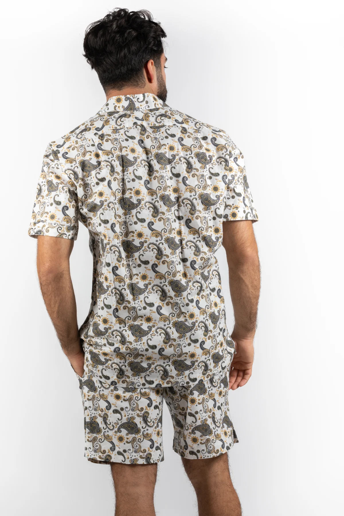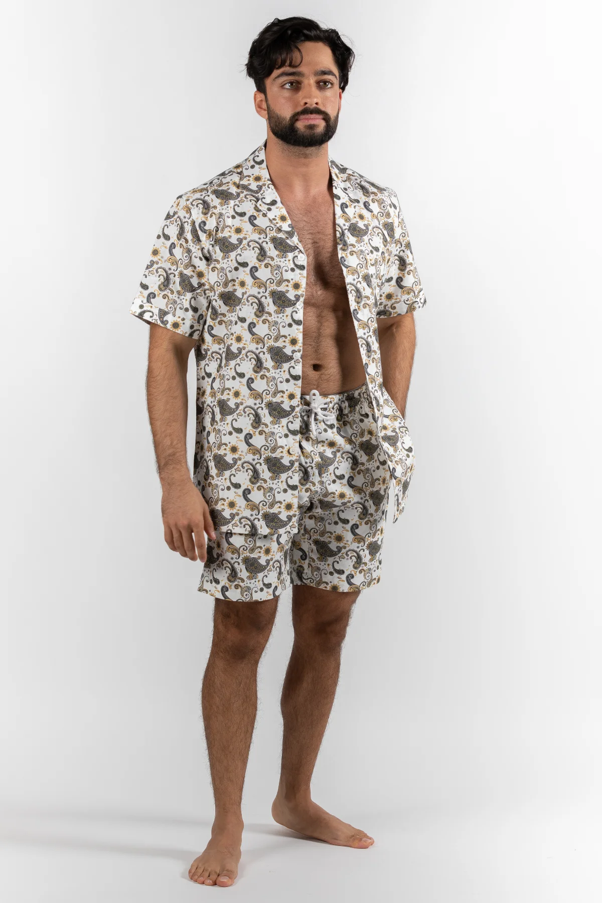 A pure soft cotton shirt tailored for a relaxed fit with a camp collar for a causal, laid-back look.