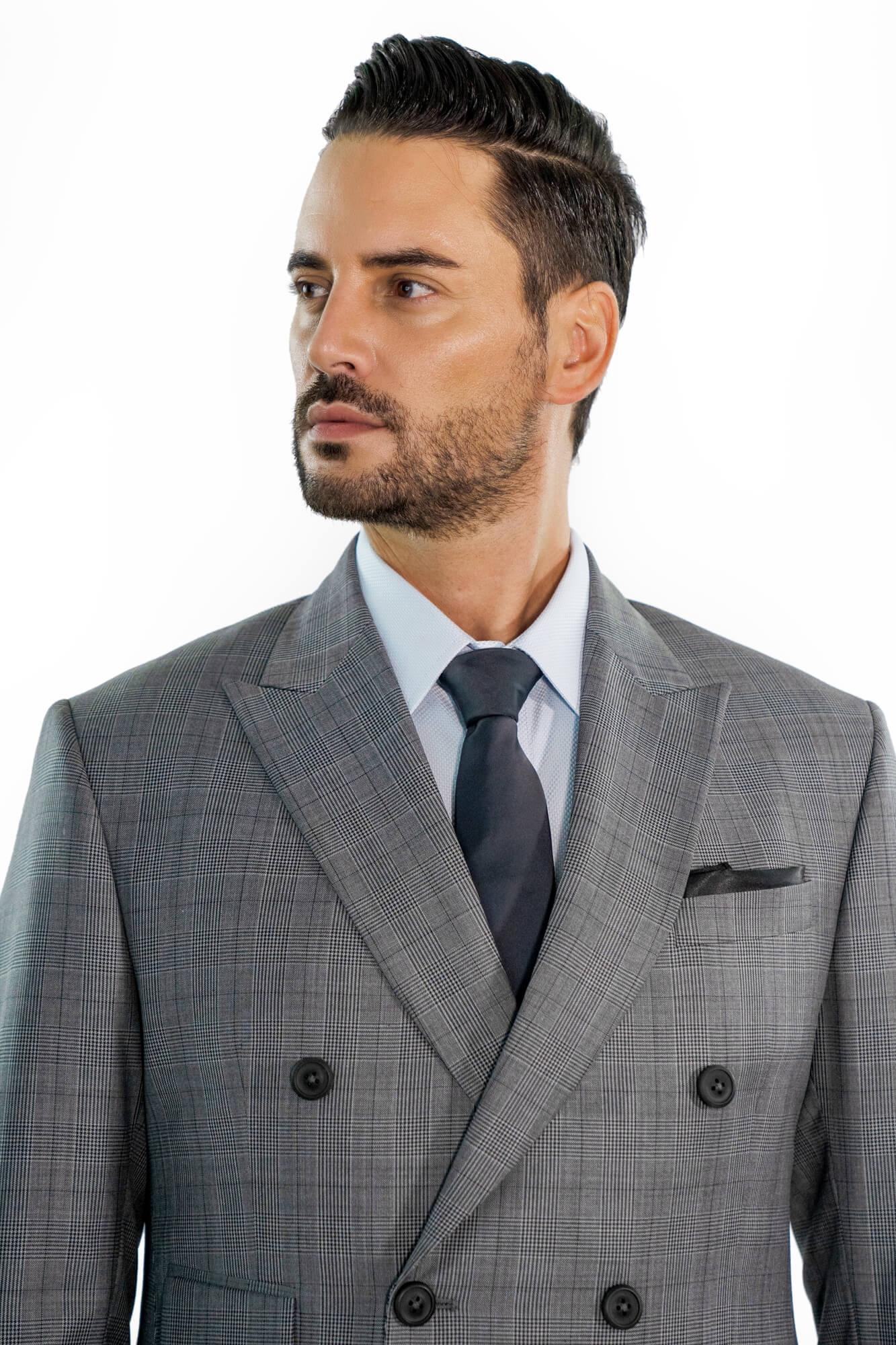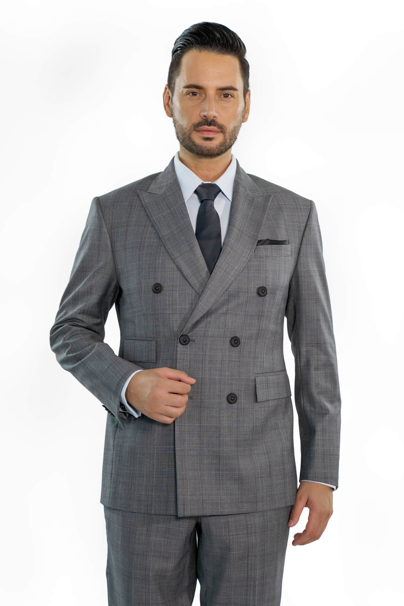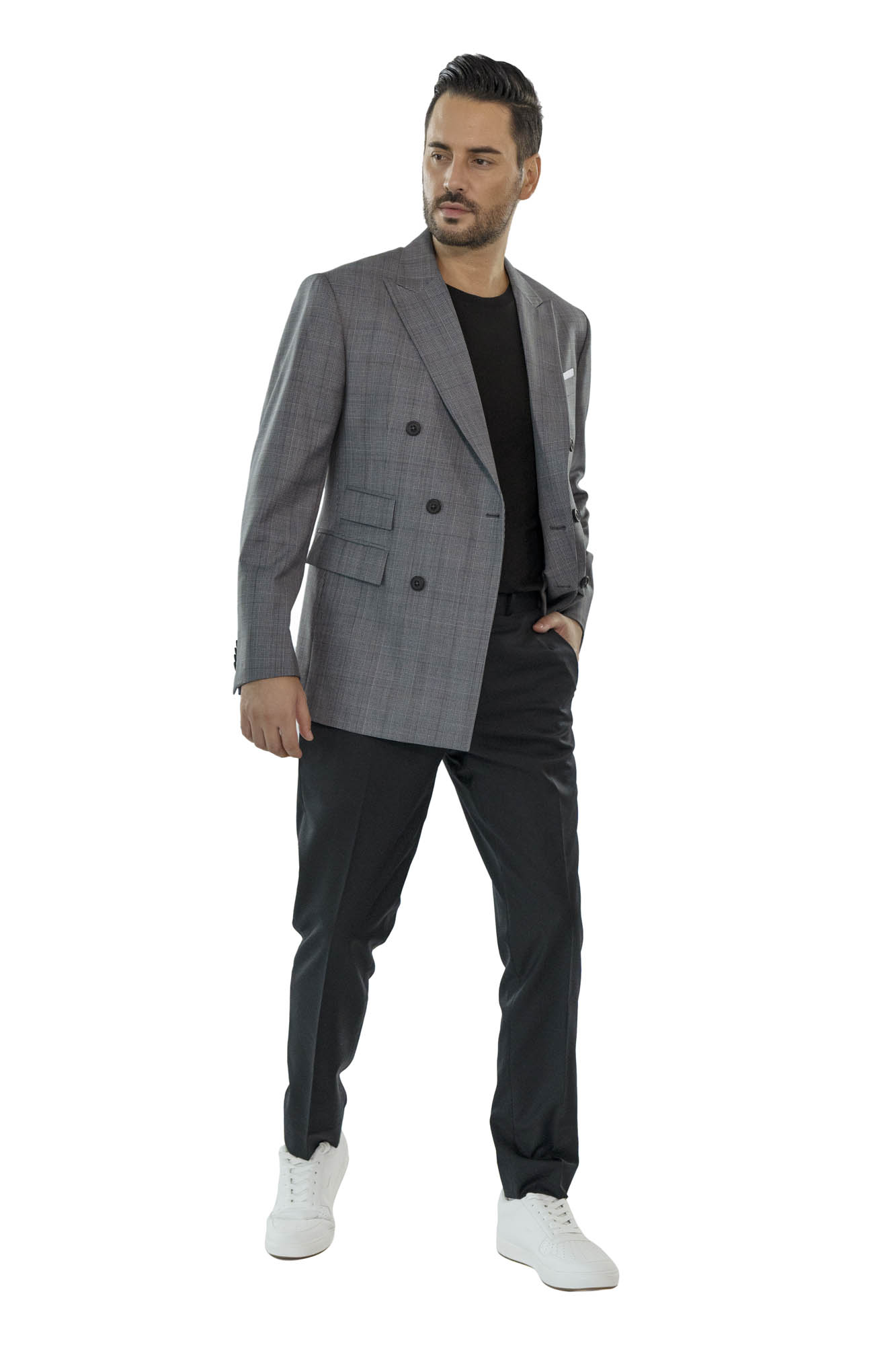 This Mid Grey is tailored to a slim double-breasted fit with minimal padding. Made from pure Tropical Wool.