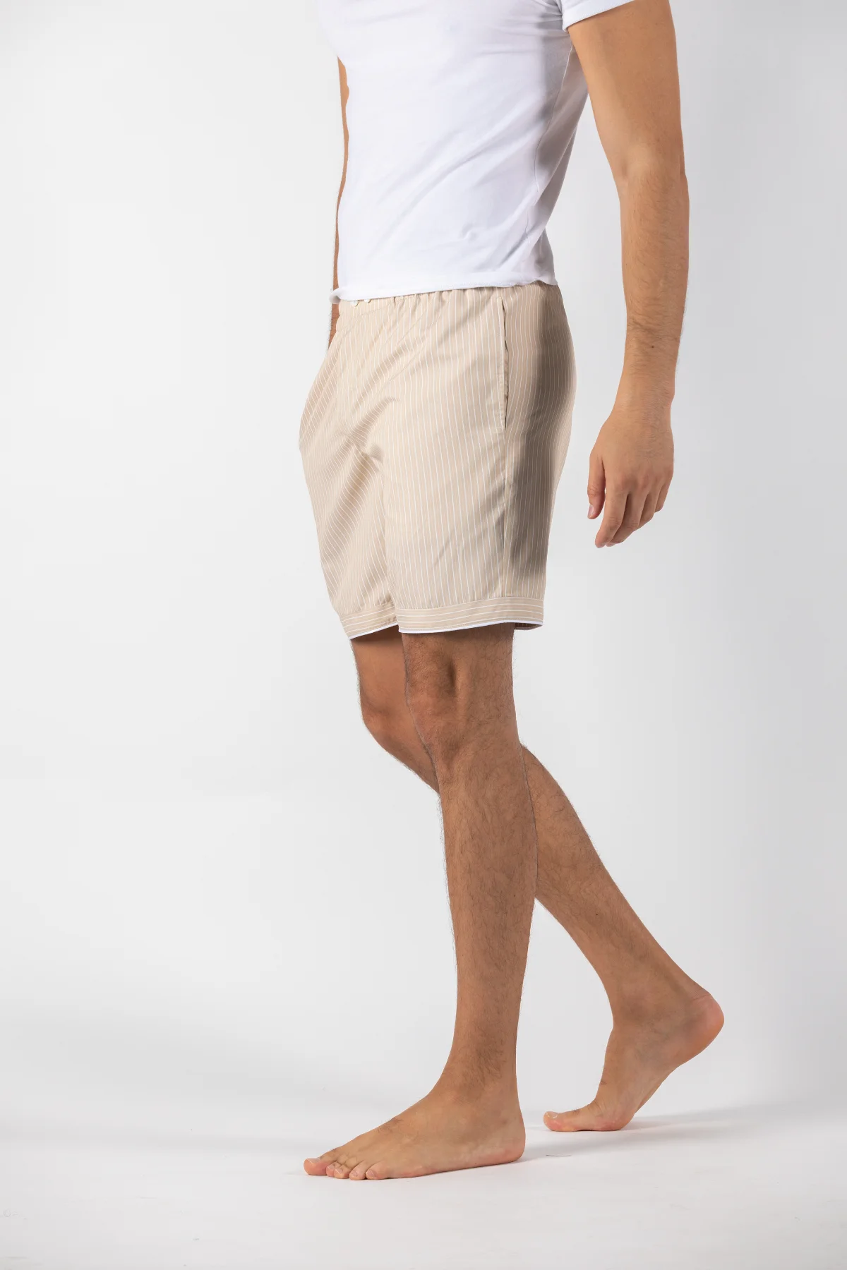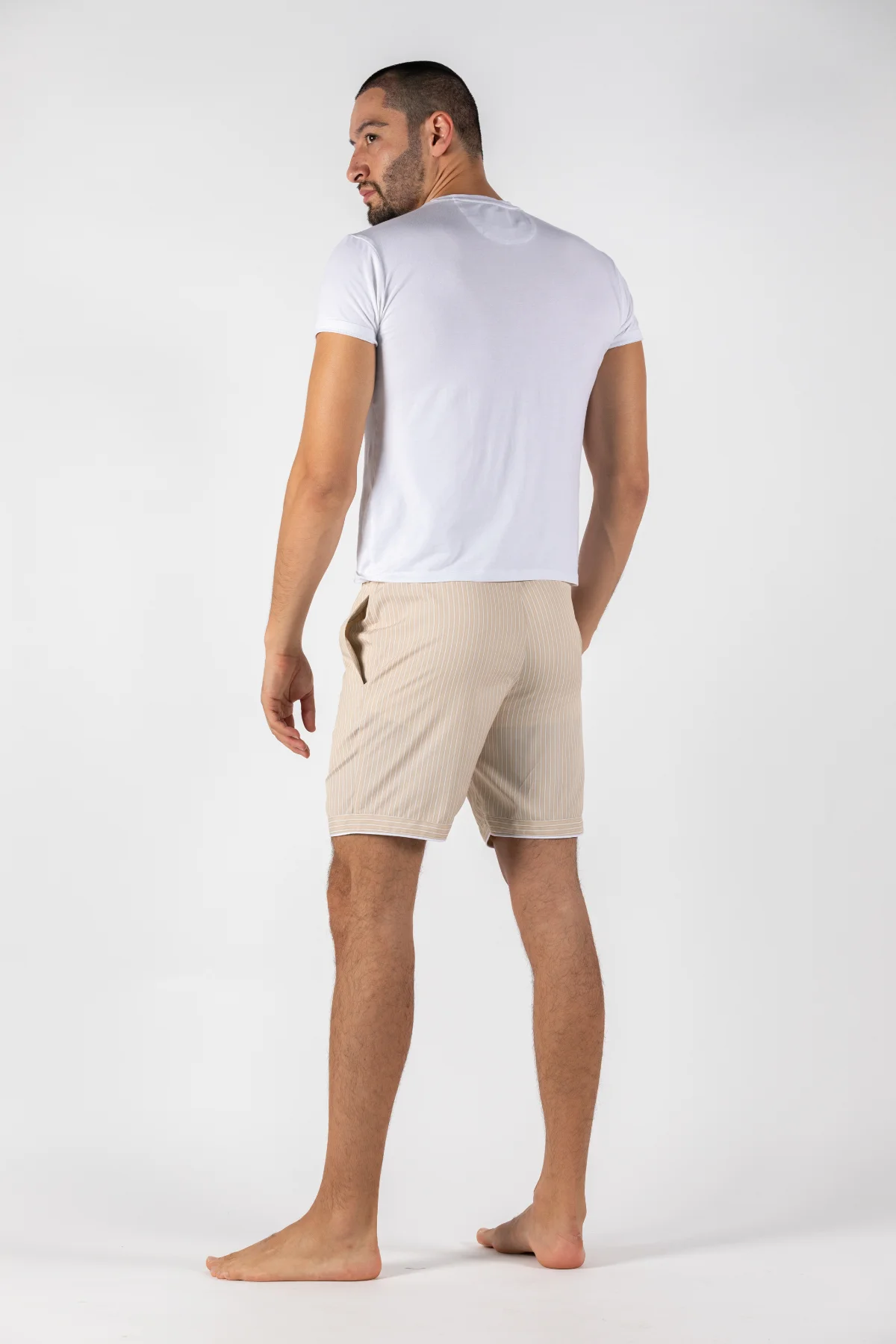 Our relaxed fit Shorts. designed for a streamlined look we replaced the drawcord with a two button waist band and elasticized sides to give you a modern and elegant look and feel