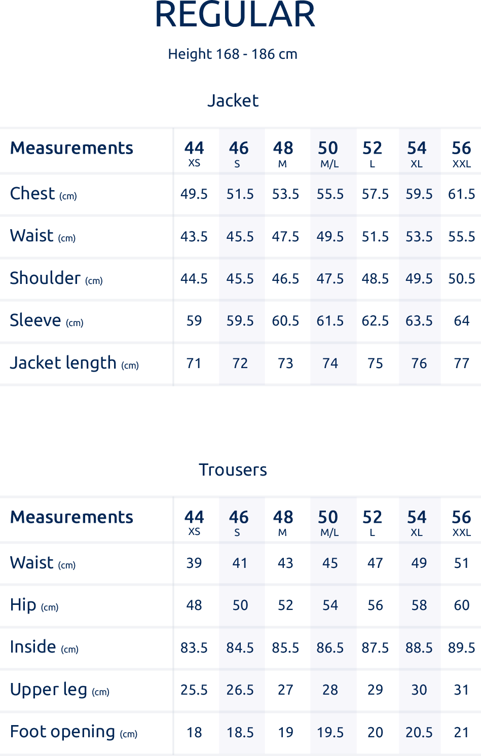 XS – 44, S – 46, M – 48, M/L – 50, L – 52, XL – 54, XXL – 56