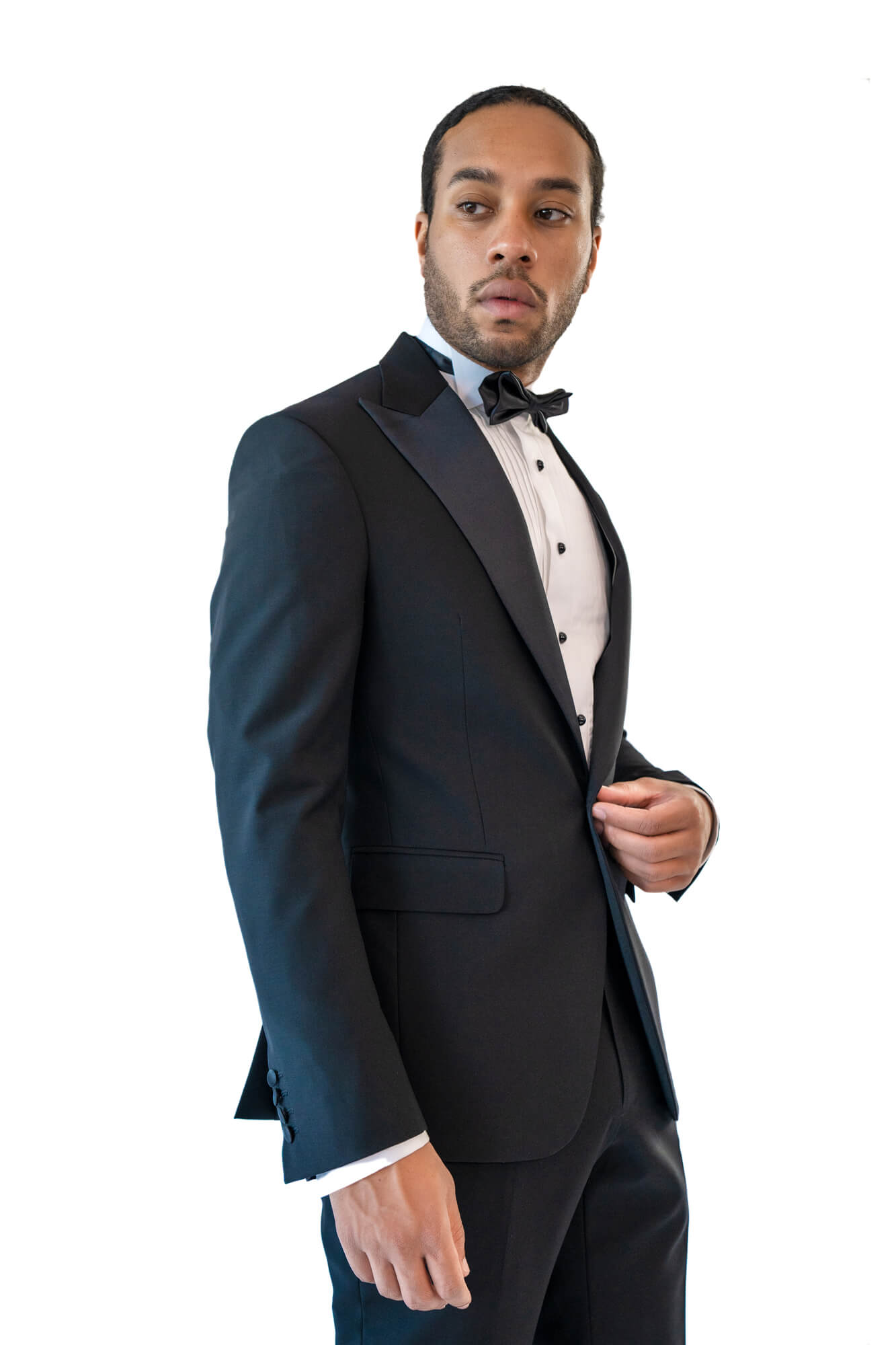 This handsome Super Black Tuxedo Jacket comes in an unparalleled deep hue. Fixed with lightly padded shoulders, a single silk-covered button, silk-lined straight pockets and a slightly curved silk-covered peak lapel. Its comfort and style makes it a must have!