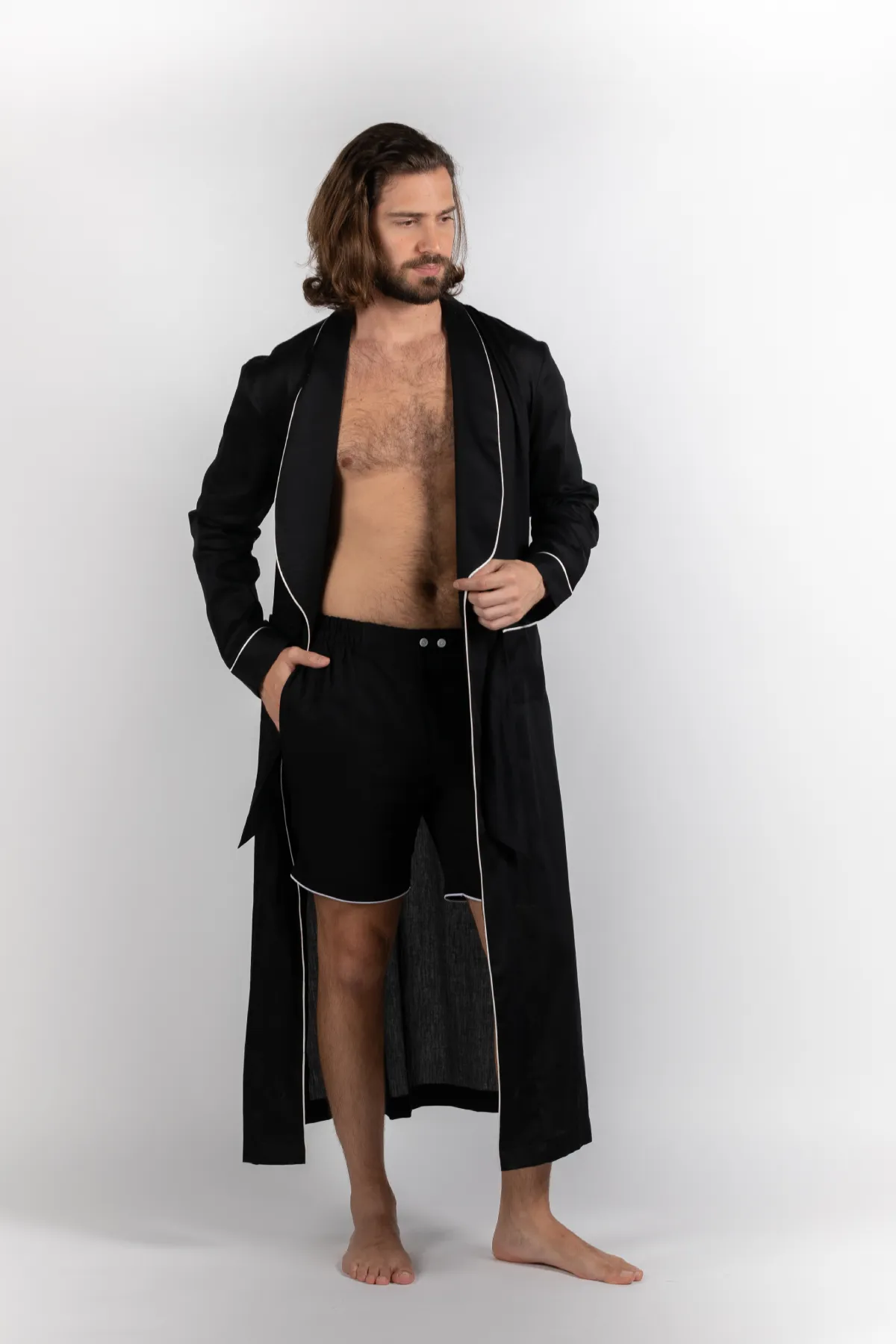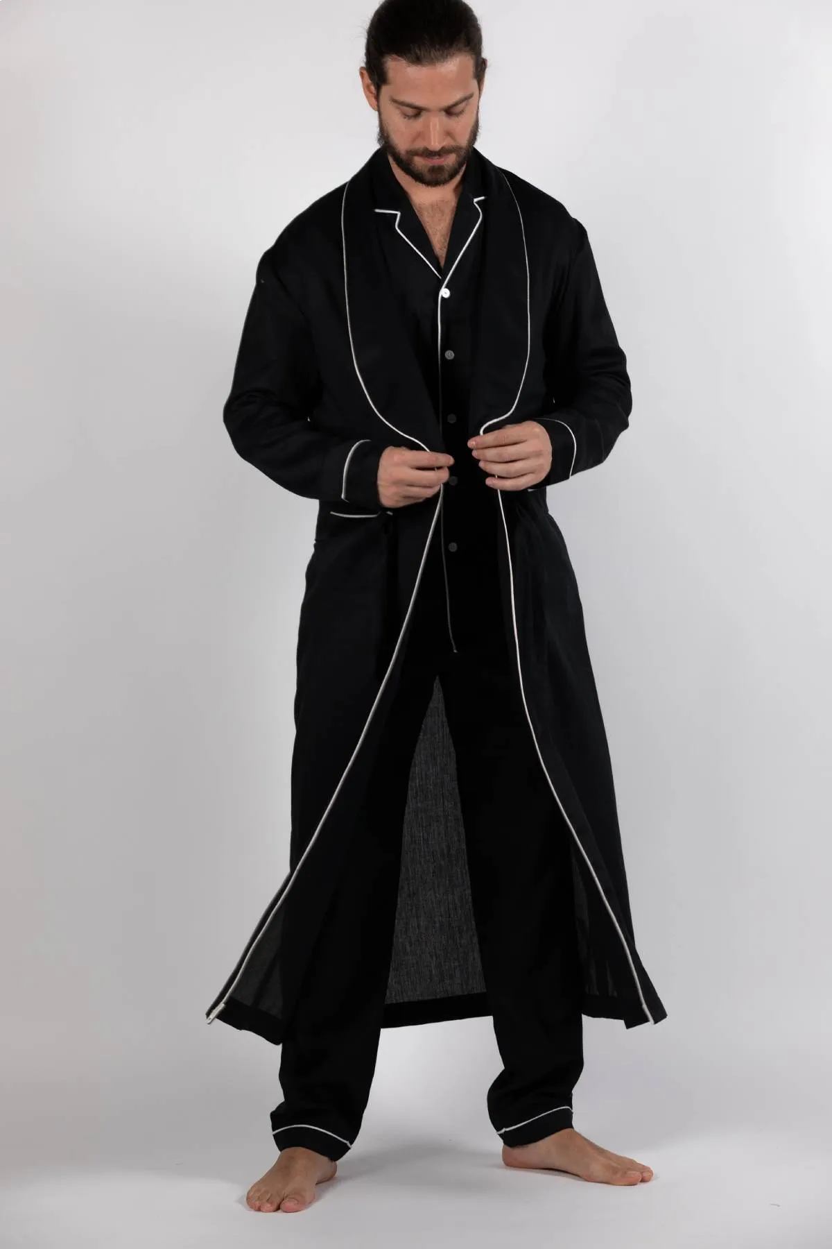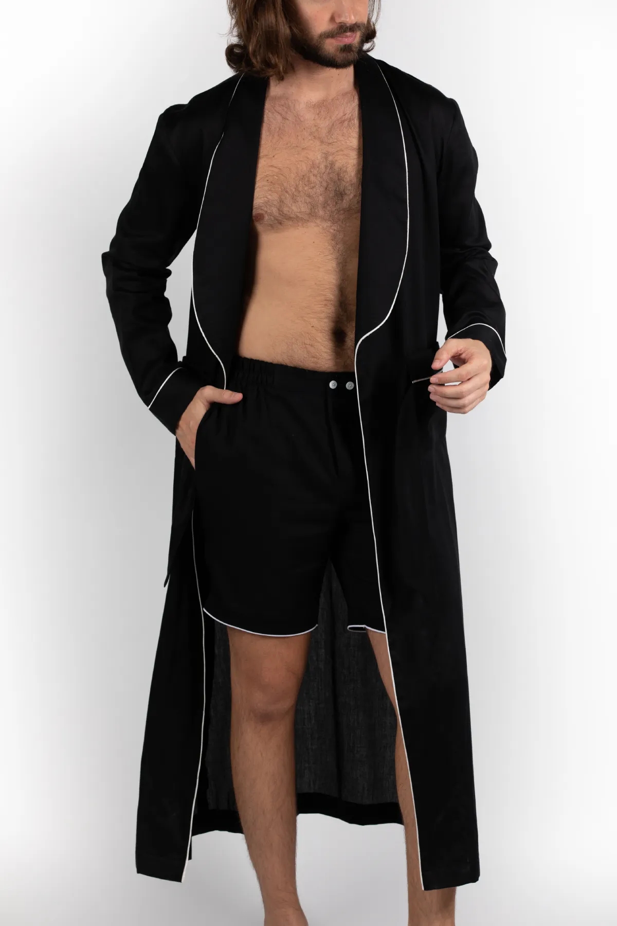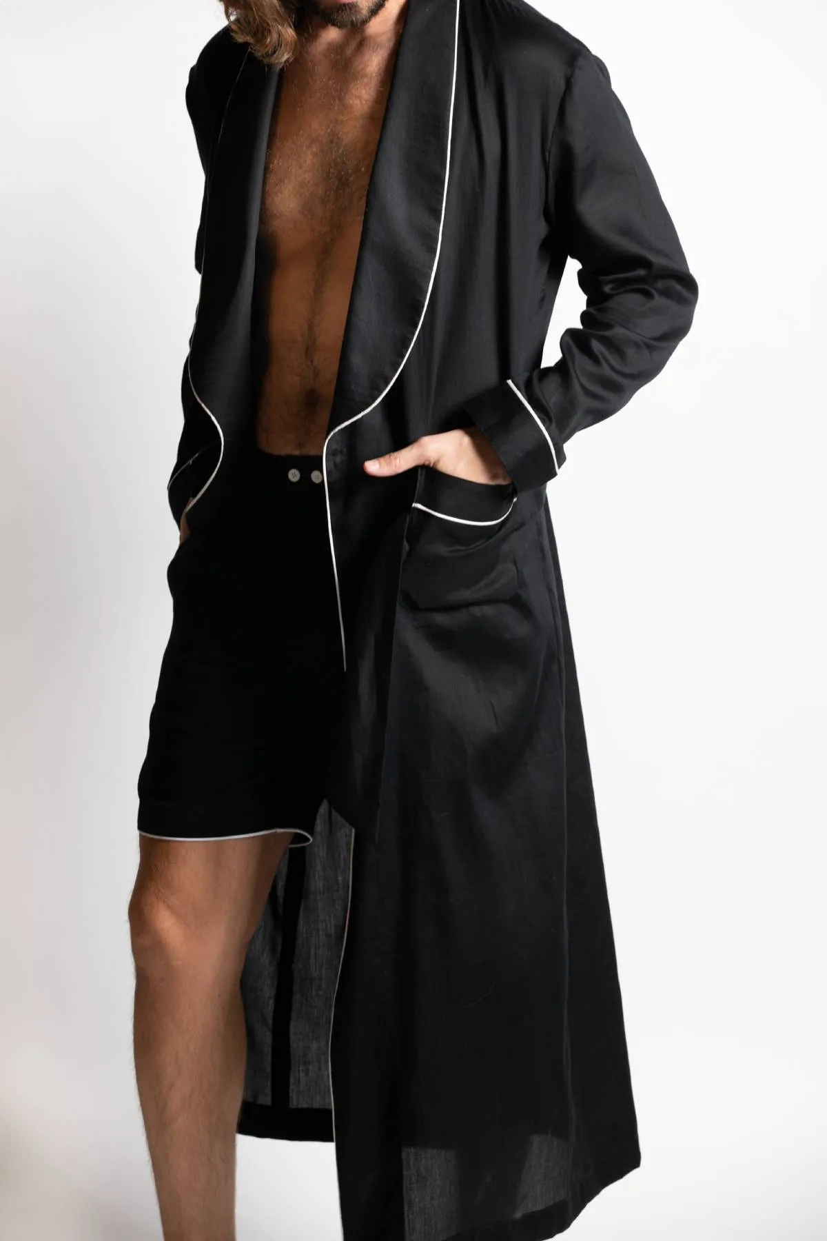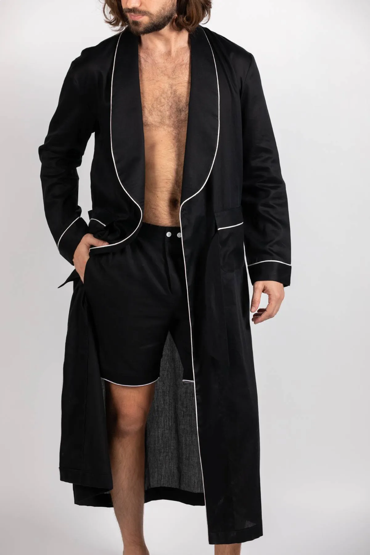 Crafted from soft Indian cotton and tailored with every Detail in mind it is designed to perfection. with a button on the inseam for the ideal overlap and a tie-fastening running through the pockets for you to slip in your hands with ease